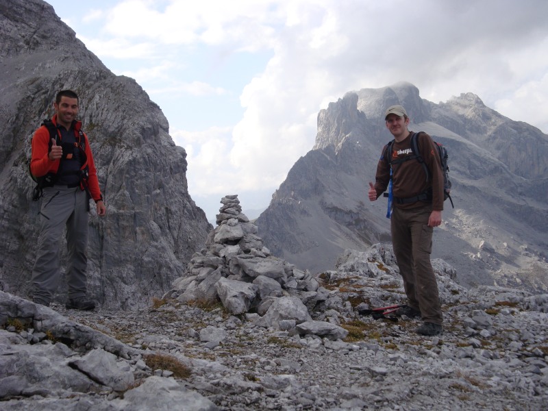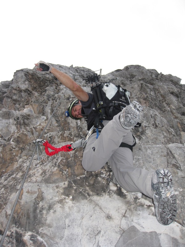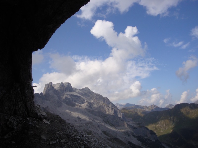Der folgende Zustieg zum Klettersteig forderte dann noch ein paar Schweisstropfen. Die Klettergurte waren schnurstracks angelegt und es hiess “Helm auf ” diesmal mit Stirnlampe bestückt. Der Einstieg des Klettersteigs ist einfache Reibungskletterei, es gibt wenig Eisen. Es folgt eine steilere Partie über Stahlklammern. Über einen kurzen Quergang erreicht man dann endlich den Eingang zur Gauablickhöhle. Von hier aus hat man einen super Blick zu den drei Türmen. Frohlock! Wir waren froh über das dünne Stahlseil, an dem wir uns durch die stockdüstere Höhle hangelten. Es geht tief in den Berg hinein. 350 Meter lang ist die Höhle und man macht darin ein paar versteckte Höhenmeter. Nachdem wir wieder Tageslicht erblickten, gabs noch ein paar Klimmzüge und schon bald war der Ausstieg auf dem Karrenfeld erreicht. Zwischenzeitlich rief uns Claudio vom Alpenrösli in Partnun aus an und bot uns zwei Plätze in Tonis Auto an. Es folgte ein zügiger Abstieg (oder besser: eine rasante Abfahrt) durchs Gemschtobel. Zum Verschnaufen horchten wir kurz den Alphornklängen, welche aus den Felswänden widerhallten. Insgesamt brauchten wir für den Abstieg genau eine Stunde. Toni und Claudio warteten geduldig auf uns. Nach dem verdienten Radler war somit auch für den Rückholdienst gesorgt. Danke Toni! Danke Diana!
