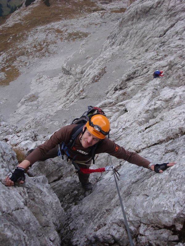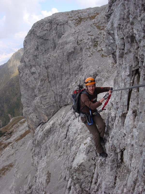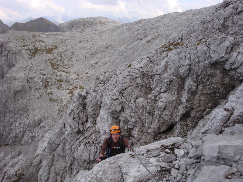 Der ganze Klettersteig mit den beiden Höhleneingängen in der linken Bildhälfte. Rechts sieht man den Rachen.