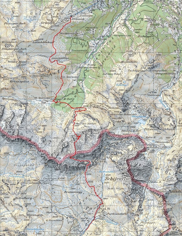 Route: Grüneck 1892m – Latschätzalpe 1735m – Lindauerhütte DAV 1744m – auf den Bänken – Klettersteig Gauablickhöhle – Karrenfeld 2660m – Gemschtobel – Partnun 16.5km, 1200 Höhenmeter