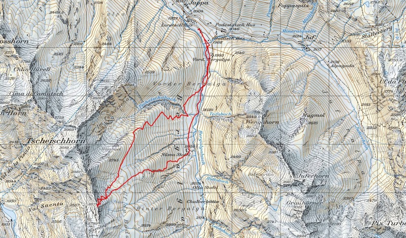 Route: Avers Juppa 1988 – Vorder Bergalga – Bödengrat Pt. 2871m, 970 Höhenmeter