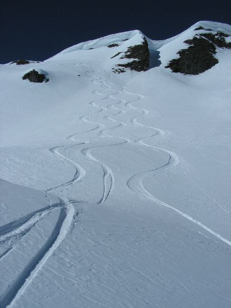 Zur Abfahrt vom Gipfel hatte es grad etwas aufgesulzen. Auf dem Grat setzte ich meine Abfahrt in schönem Pulver (Osthang) fort. Noch ein wenig sünnala auf der Güner Alp und zuletzt durch schwerer werdenden Schnee zurück zum Startpunkt.