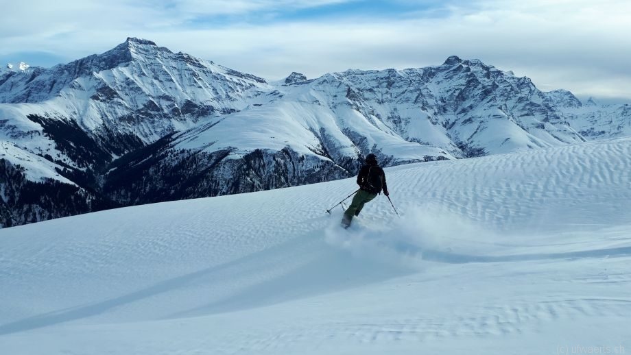 Im oberen Teil herrlicher Pulverschnee, die letzten 200-300m gestalten sich schwierig. Ein Mix von Bruchharsch, Sulz und hartem Untergrund oder ganz einfach auch zu wenig Schnee. Trotzdem eine lohnenswerte Tour und auch die restlichen Safier Hänge mit gleicher Ausrichtung sind sicher sehr gut fahrbar, solange es kalt bleibt.