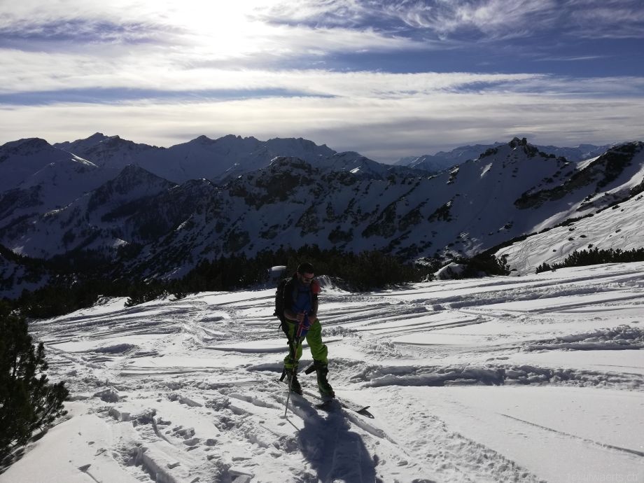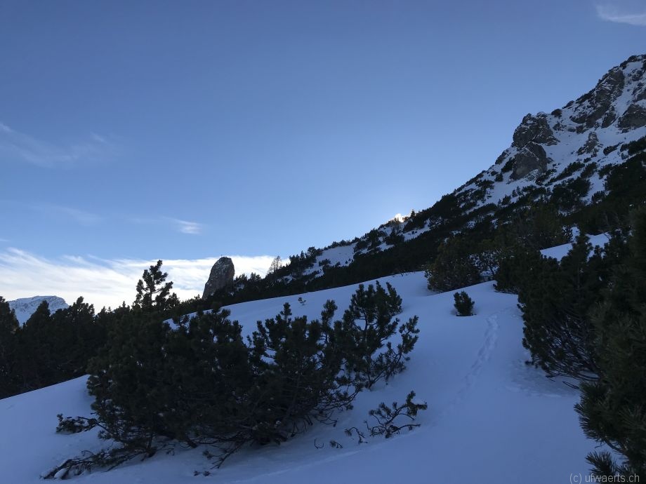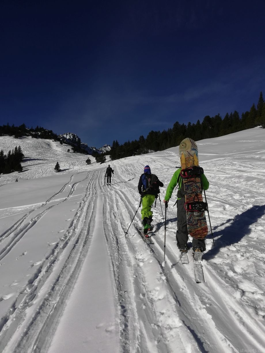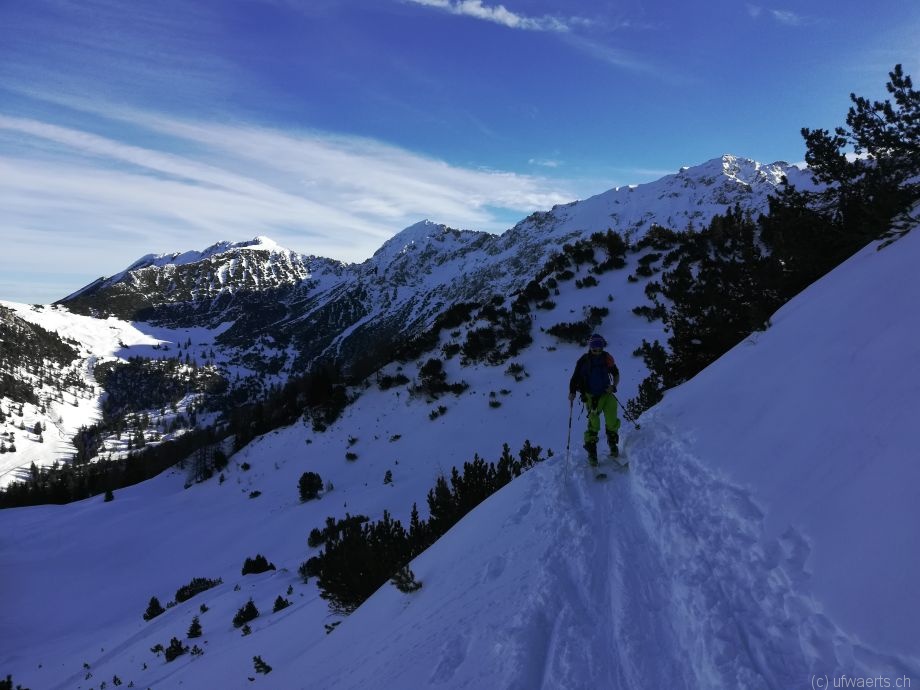 Zusammen mit meinen beiden deutschen Tourenkameraden Christoph und Jörg durfte ich endlich ein kleines Comeback feiern. Ziemlich genau 18 Monate nach meinem Tag X holt mich Snowboarder Jörg morgens am Bahnhof Buchs ab. Zuerst holen wir Christoph in Sevelen ab und dann gehts hinauf zu unserem Startpunkt in Malbun. Es herrscht Hochbetrieb auf der kurzen Skipiste, welche wir zuerst einmal queren müssen, um auf den langen Schlittelweg zu gelangen. Zuerst trüben hohe Wolkenfelder etwas die Sicht, bereits nach wenigen Metern kommt dann aber die Frühlingssonne (die Tage werden nun ja bereits wieder länger) ganz zum Vorschein. Patschifig erklimmen wir die ersten Höhenmeter und machen bei einer Hütte kurz Rast. Bald ist der Schlittelweg zu Ende. An der gleissenden Sonne gehts weiter durch schöne Landschaft, welche aber IMO nur bedingt Skispass verspricht. Ich melde mich deshalb bald kritisch zu Wort. Dass dies die meistbegangene Skiroute im Fürstentum sein soll, macht mich schon nachdenklich. Sorry, liebe Liechtensteiner – aber da müsst ihr schon mehr bieten, wenn ihr Bündner zu Besuch möchtet 😉 Postwendend haut mir Christoph ein altes bayrisches Sprichwort an den Kopf: “Die Oper ist erst zu Ende, sobald die fette Lady gesungen hat!” Und die fette Lady warte auf dem Gipfel auf uns. In Form einer super Aussicht. Und es war tatsächlich diese fat lady, welche mich weiter einhändig voran trieb. On top gabs dann wahrlich ein tolles Dessert für unsere Augen. Schon ziemlich ausgepowert, muss ich aber schliessich die Skischuhe in Downhillmodus stellen. Auf ausdrücklichen “Wunsch” von Diana wird noch eine Schüssel auf meinem Kopf angebracht. Dann nehmen wir die Abfahrt in Angriff. Im tiptoppen Schnee kriege ich einige ansehliche Schwünge hin. Mit abnehmender Schneequalität nimmt jedoch auch meine Fahrqualität zusehens ab! Der Bayer und der Pfälzer meistern alle Hänge in gewohnter Manier. Die Schlüsselstelle, eine längere Traverse, meistere ich zusammen mit Christoph mühsam zu Fuss, während Jörg weiter abfährt und zu Fuss weiter hinten wieder aufsteigt. Also wirklich Spass macht dieser Abschnitt auch in gesundem Zustand kaum! Der letzte Teil der Abfahrt führt wieder über den Schlittelweg zur Piste hinunter. Um sturzlos hinunterzukommen, bremse ich per Pflug. Das schafftschliesslich auch mein gesundes, rechtes Bein vollkommen. Also die Trainingseinheit auf dem Laufband fällt für heute Abend aus 🙂