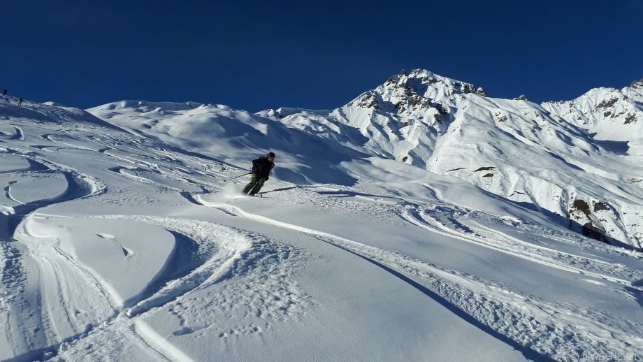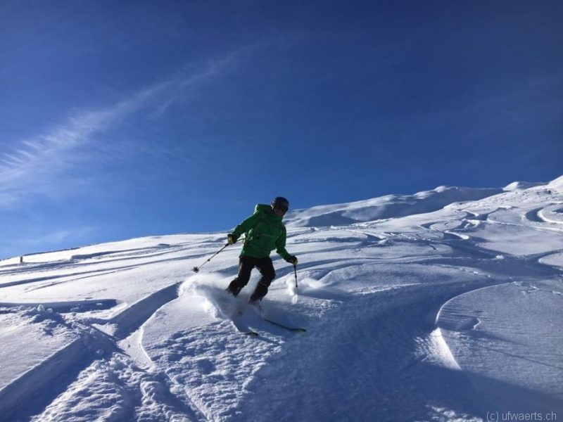 Die Abfahrt ähnlich wie gestern, im oberen Teil absolut genial, unten dann naja, man mogelte sich da irgendwie durch. Schwieriger war es heute noch, da es deutlich mehr Spuren als gestern am Zalöner hatte. Aber die Abfahrt vom Güner Lückli kanalisiert sich halt gegen unten hin, während der Zalöner Grat die breiteren Hänge und somit mehr Auswahl aufweist.