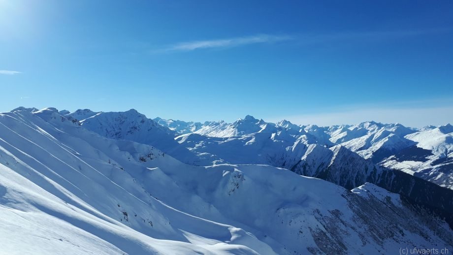 Gleicher Schauplatz (Safiental), neue Szene. Auch wenn es nicht so ausgeschaut hat, die Tour auf den Zalöner Grat gestern war für Andi und mich eine Tortur. Deshalb schlossen wir uns heute einer «Gemütlichen, 600 -700 Höhenmeter-Mit-Viel-Pause-Dazwischen-Gruppe» an: Eine Knie Post-OP, ein Skitourenanfänger, ca. 3 kaputte Füsse und noch einen Rest Weihnachts-Grippe. Da fehlte eigentlich nur noch Mr. Ufwärts (jederzeit gerne!)! Mit dieser vielversprechenden Ausgangslage stiegen wir heute von Gün (1600m) aus diretissima zum Güner Lückli auf. Korrigenda: Es gibt doch ein paar sehr stark verspurte Saifer-Hänge, so präsentierte sich uns vor allem der untere steilere Abschnitt bis unterhalb der Meiensässe.